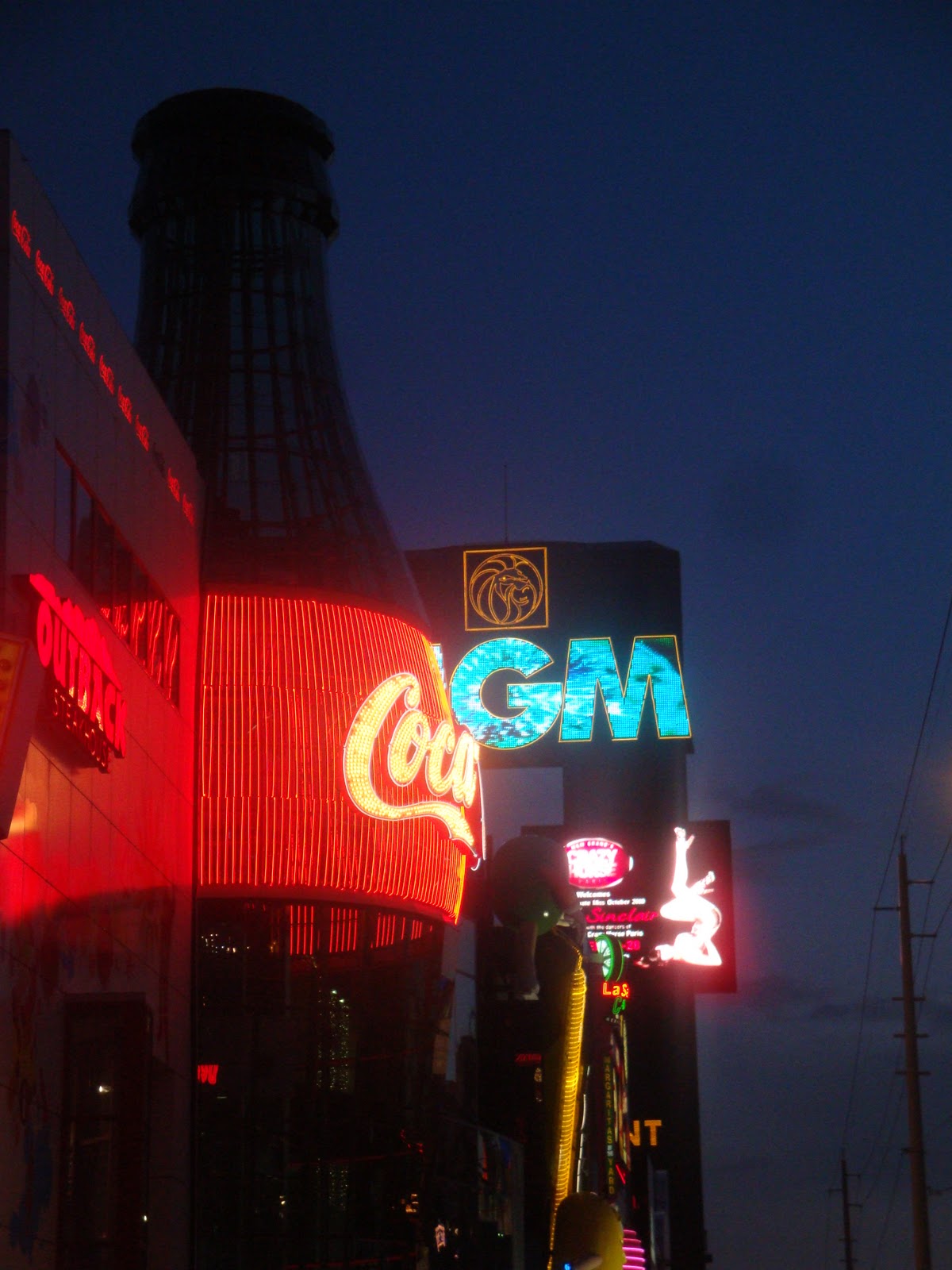Driving into the city, the amount of signage imposed on the driver increases exponentially the closer he or she gest to the strip. Whether 1977, 1997, or 2007, Las Vegas signage is the equivalent of desert monarchy. Yet despite this dominance, its rule often proves malleable. “The most unique, most monumental parts of the strip, the signs and casino facades, are also the most changeable,” notes Venturi and the others. (34) Michael Dear agrees. Dear, an expert on urban postmodernity, remarked that as hotel building took off in the 1950s, signs served as a kind of “logic and grammar” providing “coherence and form to adjacent buildings.” (Dear, 202) However, in the 1980s, the Strip’s economic expansion resulted in larger hotels, sharply crafted marketing schemes, and a general ordering of affairs under a more organized business approach. Alan Hess has labeled this period “corporate splendor,” as “blockbuster corporate architecture” towered over the Strip, thus, “elbowing out the glorious neon signs.” (Dear, 203) Such monumentalism created spaces between the now “self contained islands” that Las Vegas Casinos had become. Here a “lively” street life emerged. Signage’s importance persists in these spaces.