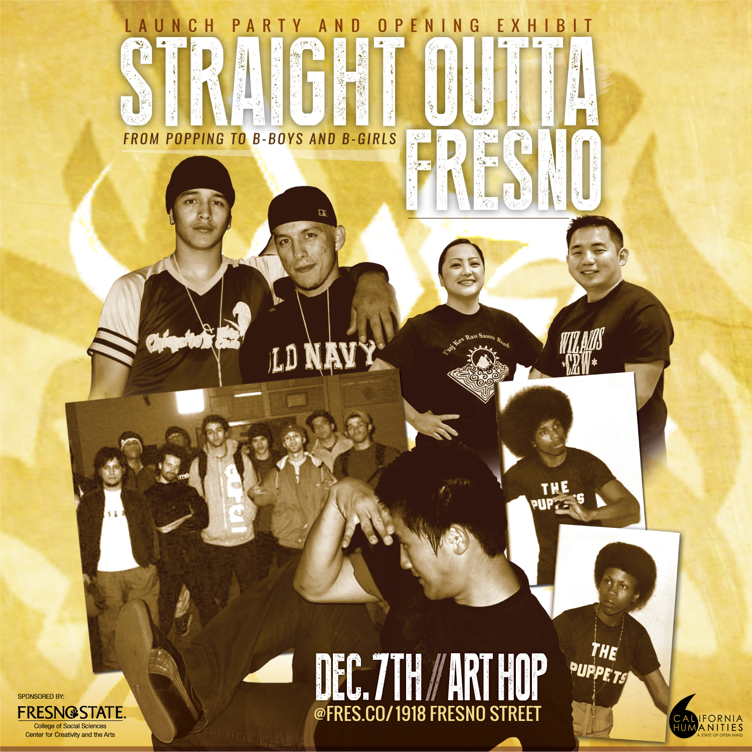 With generous funding from a California Humanities “Humanities for All” grant and with the support of our community partners FresCo and Topics of Meta, we will expand on these efforts over the course of the 2017-2018 academic year. Our first event will be a free exhibit launch party on December 7th at FresCo. Next, we are inviting winners of the “Battle of the New Year” to be hosted December 27 at Fresno’s Hmong New Years Festival and winners of our own battle taking place February 3rd at Fresno’s iconic b-boy spot, Holmes Park, to a final battle at Fresno State that will include an exhibit and a panel discussion featuring multiple generations of Fresno hip-hop dancers. Each event will include on-site walk-in oral histories and photo digitization with all materials being uploaded to our archive.